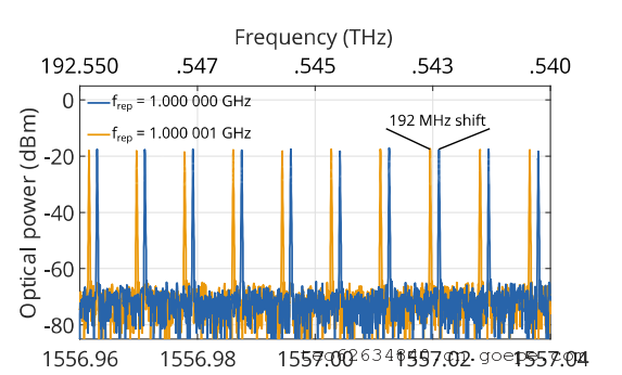 MENHIR-1550飞秒激光器具有稳定两个梳状参数(fCEO和frep)的所有输入。每个梳状线的定义为f = fCEO + n frep,其中n 是一个接近200,000的整数值。图3 描述了将重复频率微小变化1 kHz与基准重复频率1.0 GHz的激光器相比的效果。橙色的迹线 相比蓝色迹线向较高频率(即波长较小)偏移,这是由于在恒定fCEO下,梳状线间距稍微增加所致。