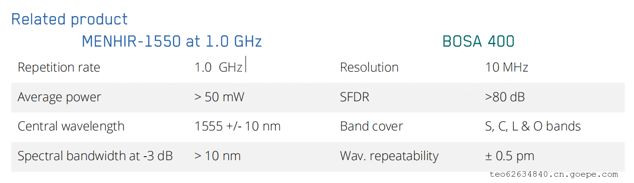 针对高分辨率频率梳检测,我公司可以提供成套设备:包括高稳定性MENHIR-1550飞秒激光器和高分辨率Aragon Photonics BOSA光谱分析仪。