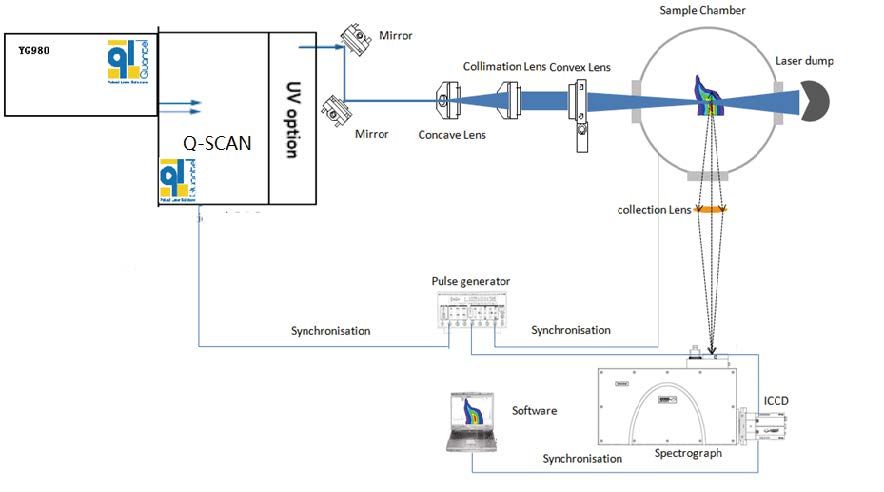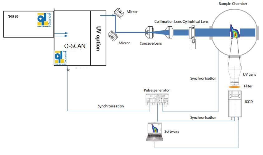 • 探测系统:根据要求采用合适的ICCD,进行适当的延迟后得到特定时刻的荧光信息;同时还可以加上光谱仪等设备,进行光谱分析,以便得到更丰富的信息;