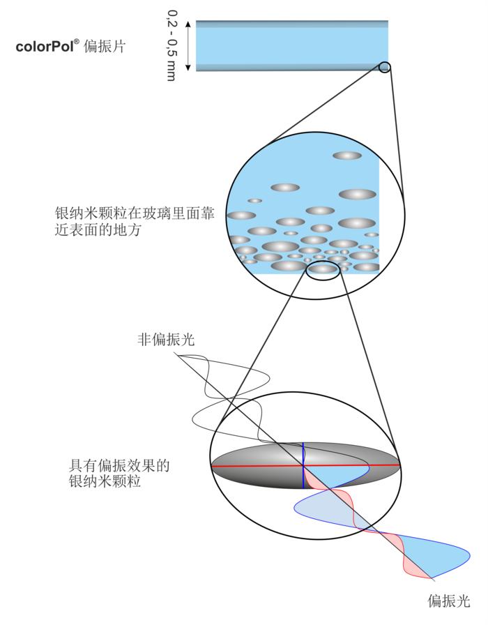 通过CODIXX的特殊制造技术,可以精准确定银纳米颗粒的大小、密度和方向。椭圆形的几何形状产生偏振特性所需的一个长轴和一个短轴。它们根据波长吸收光的所有横波,仅允许沿对称轴方向的光波通过。所有纳米颗粒的分布必须绝对平行,以产生完美的线偏振光。