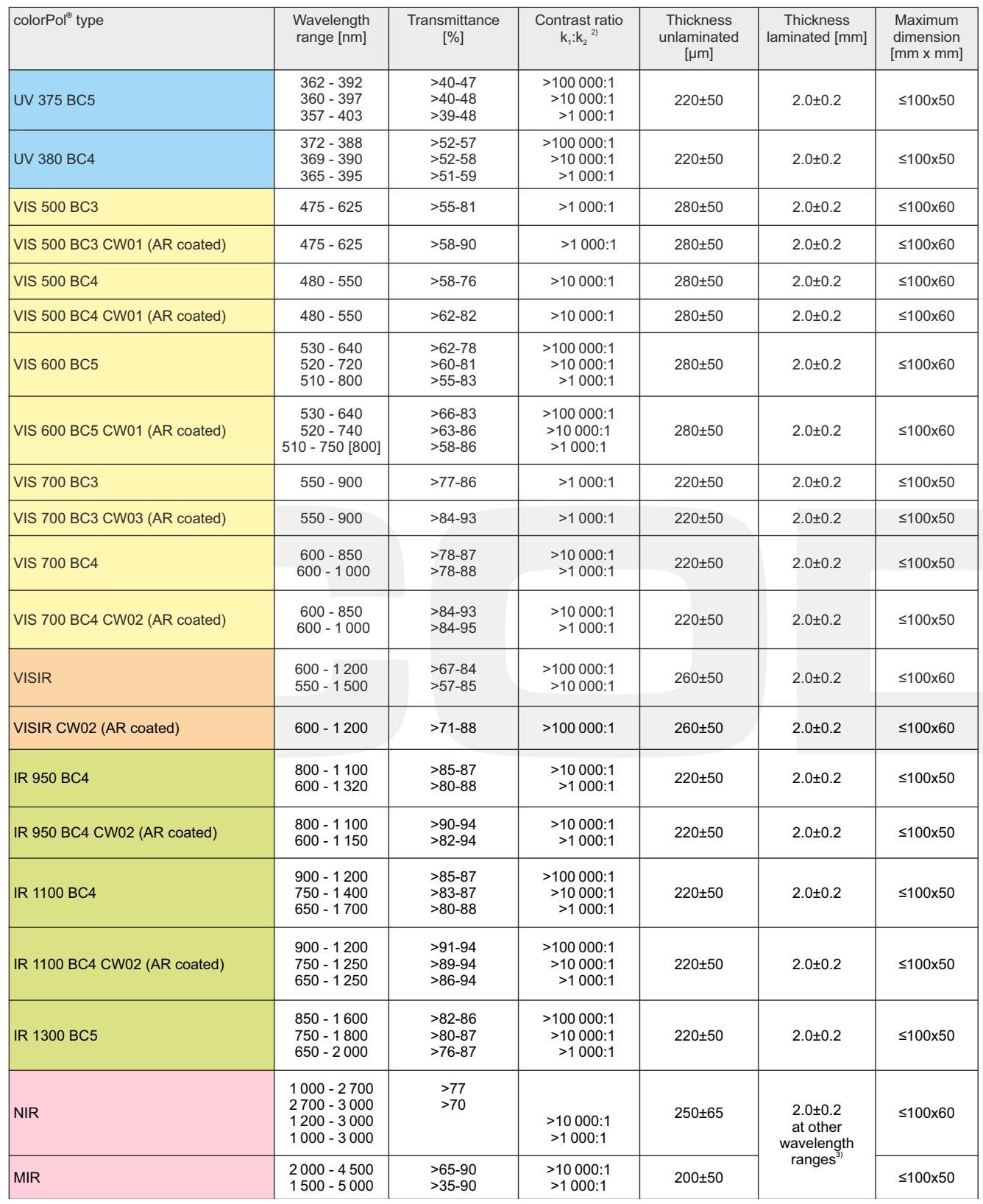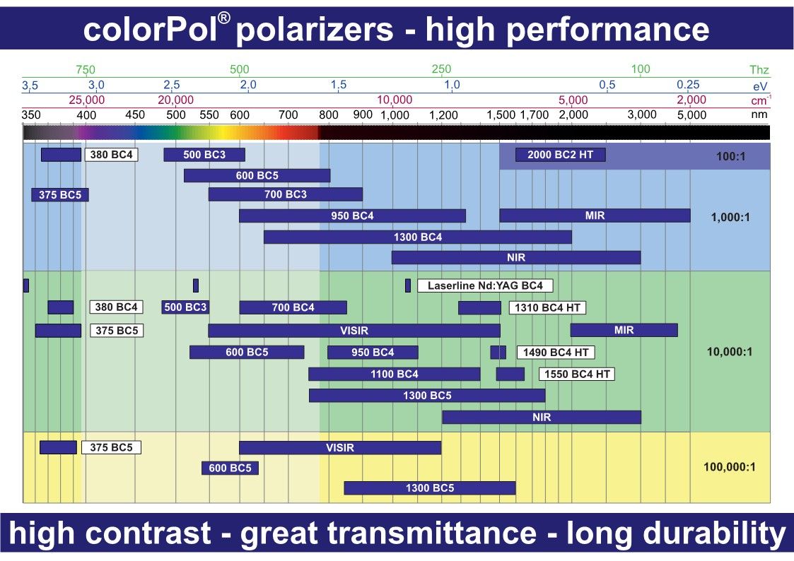 colorPol® 偏振片是由带有银纳米颗粒的高强度钙钠玻璃制成的二向色玻璃偏振片,偏振片可用于紫外波长范围(340 nm - 420 nm)和VIS、NIR、MIR波长范围(440 nm - 5.0 μm),大入射角±20°,偏振轴精度高,透过率*高可以达到96%,消光比*高可以达到100000:1。